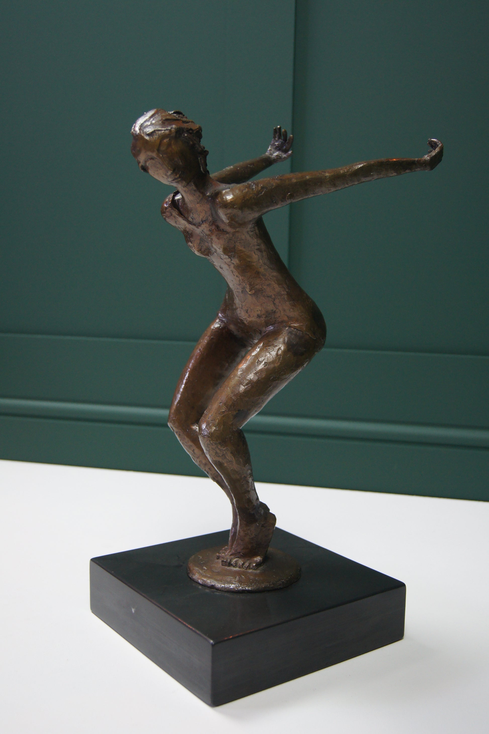 This finely crafted bronze ballerina figure is expertly mounted on a black marble socle, combining artistic elegance with substantial weight for stability. The timeless design captures the grace and poise of ballet, making it a distinguished centrepiece for any interior. The solid marble base not only enhances visual appeal but also ensures durability and balance.