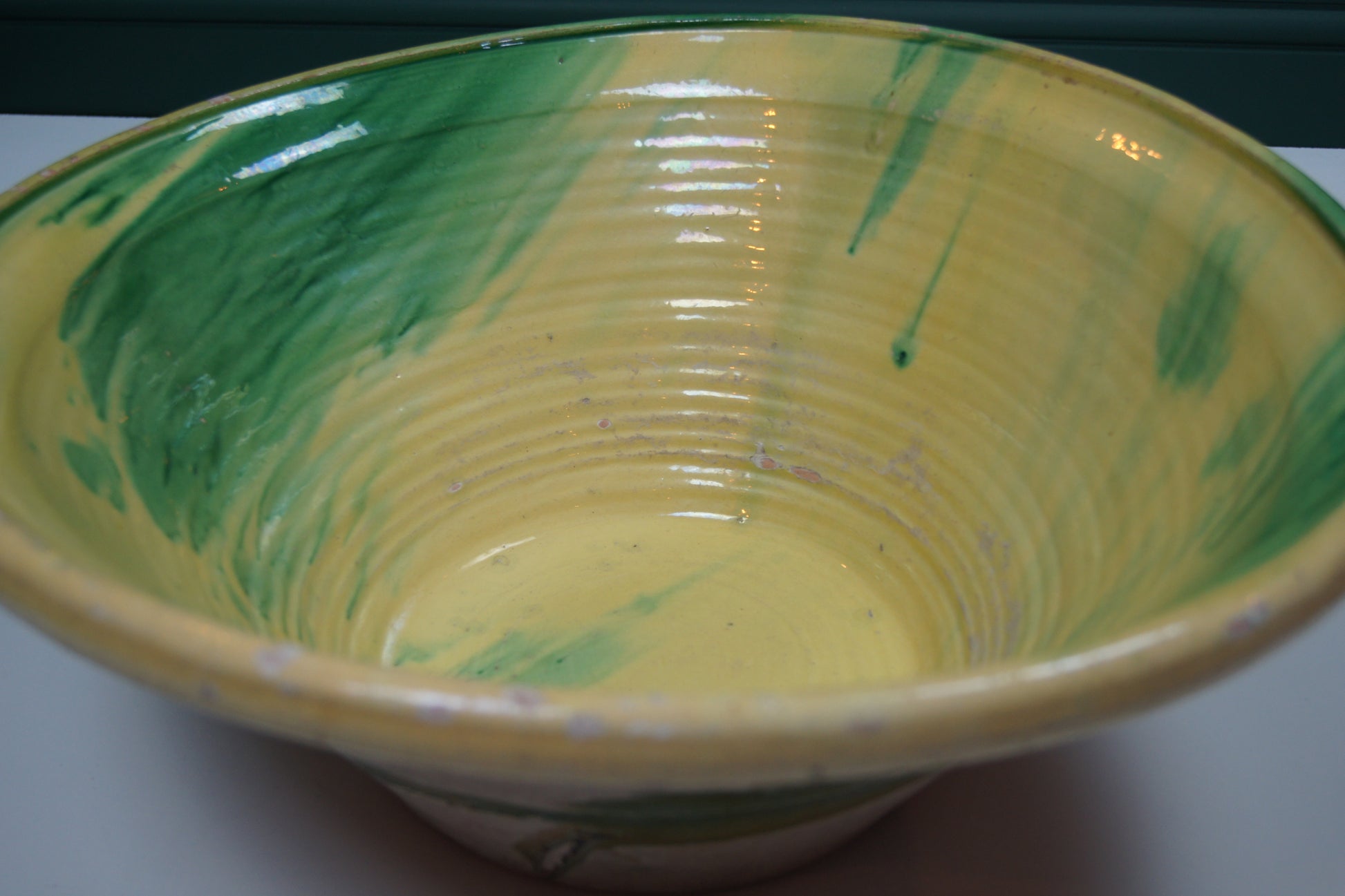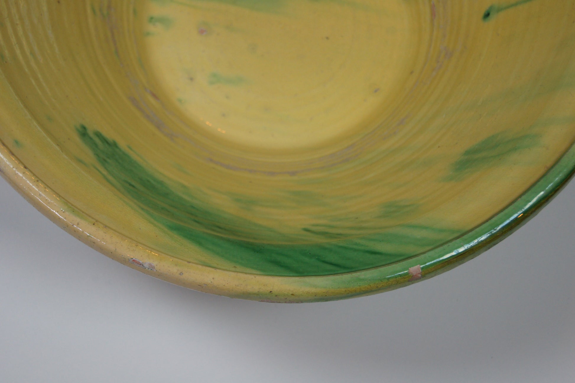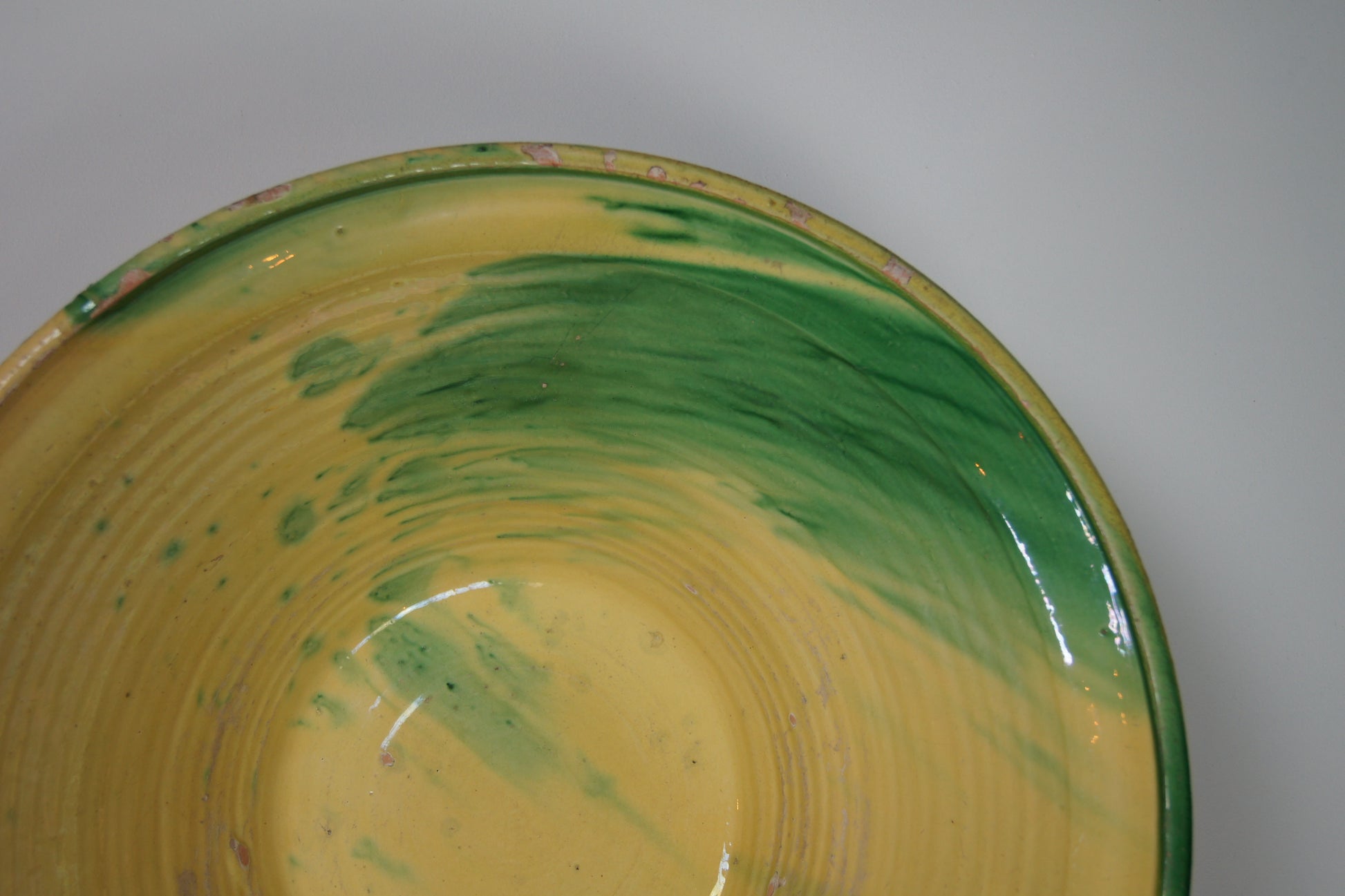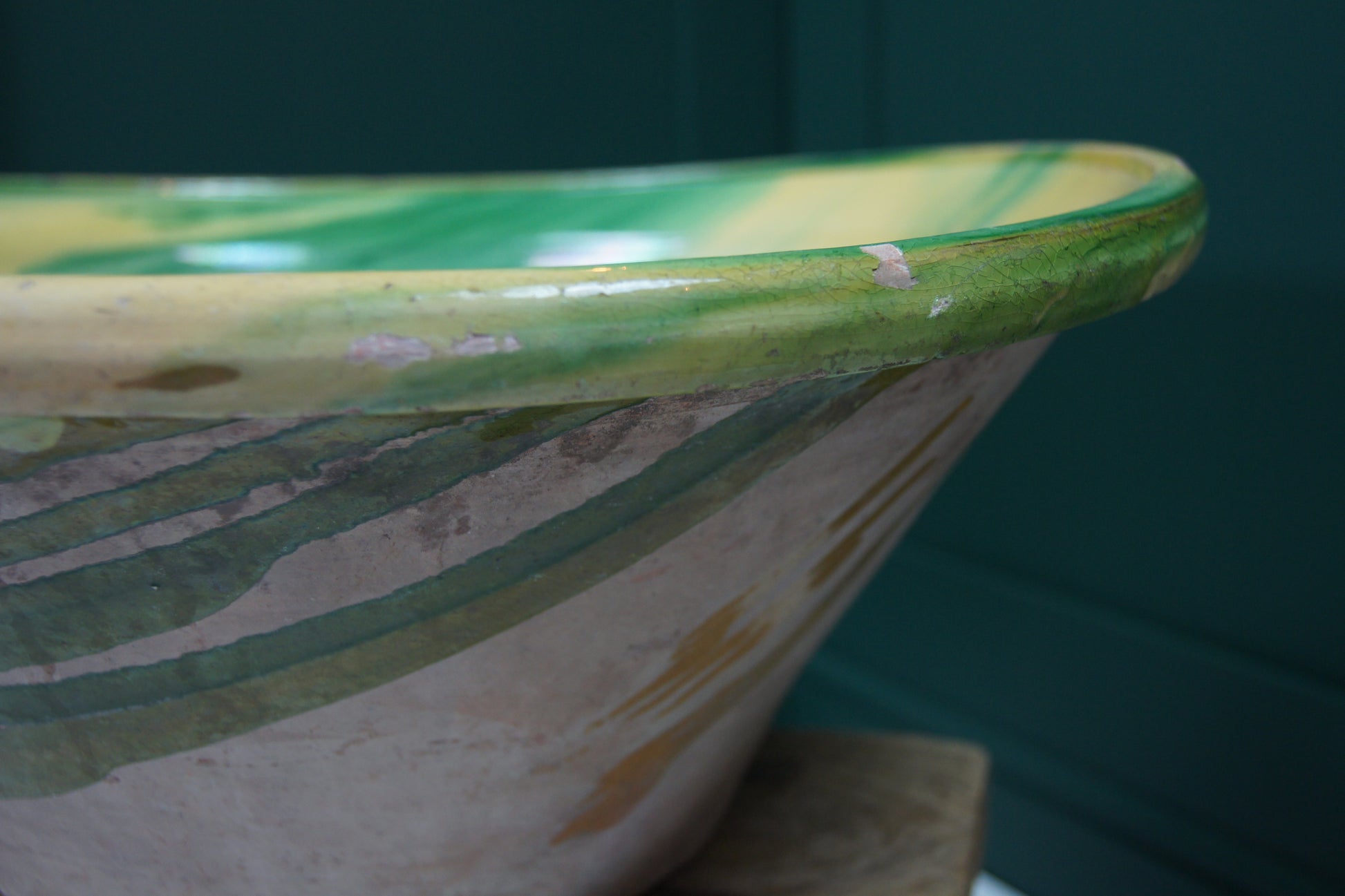 This large antique Spanish terracotta Lebrillo bowl dates back to the 19th century and features a distinctive yellow and green internally glazed finish. Its rustic charm and historic appeal make it a striking piece for collectors or as a unique decorative accent. Its generous size and authentic patina bring a touch of Mediterranean heritage and warmth to your home, perfect for display or functional use with a story to tell.