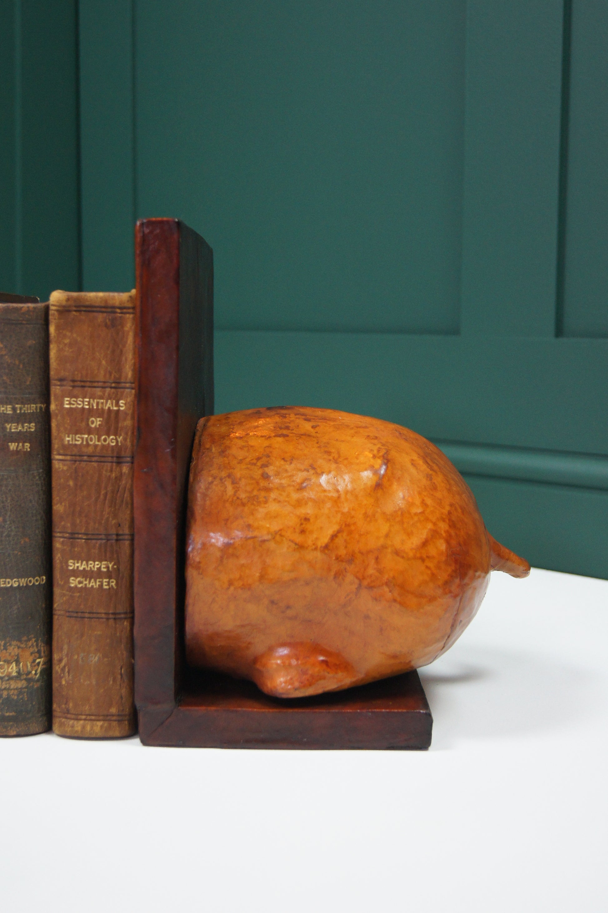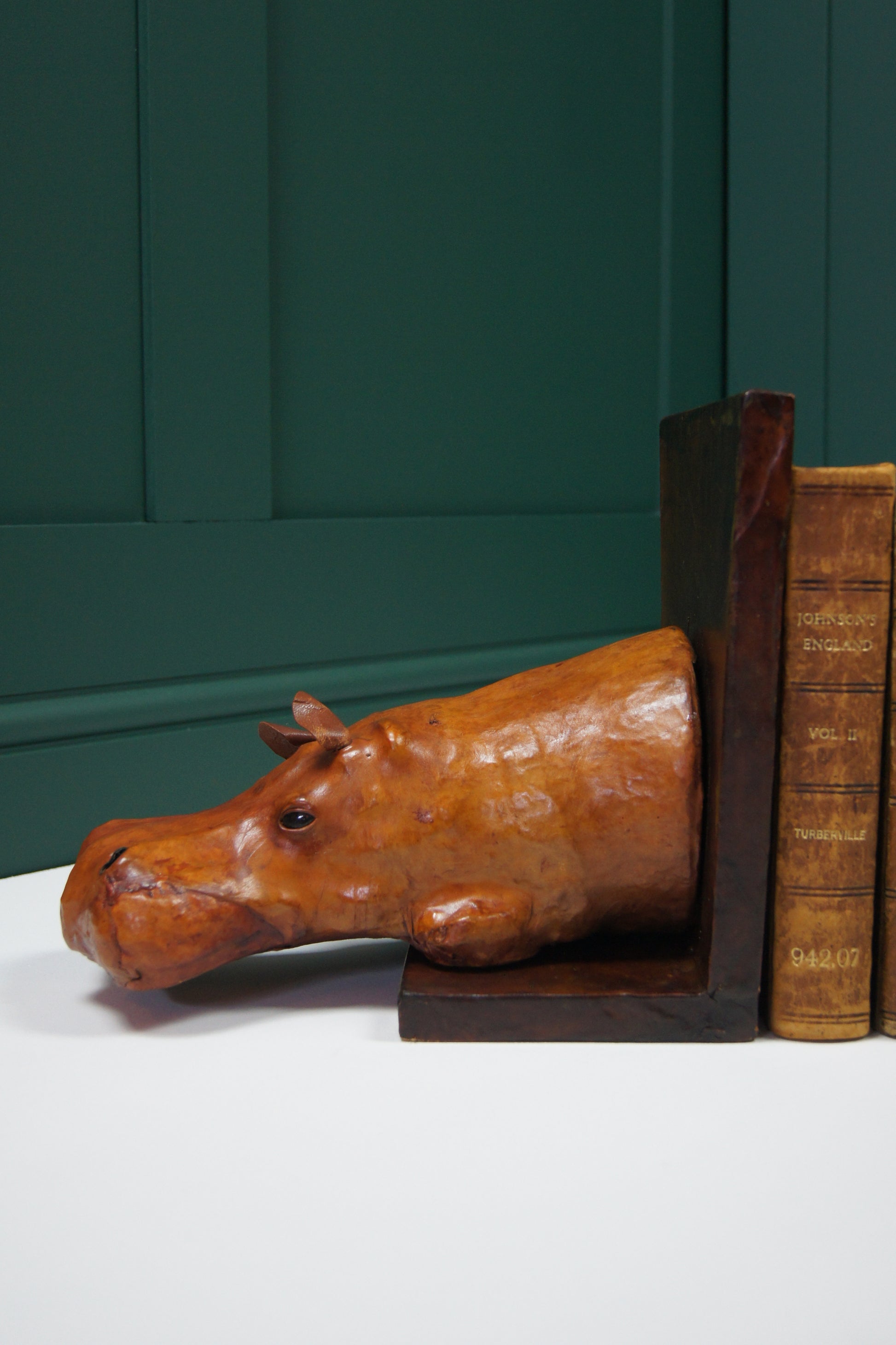 Elevate your bookshelf with these large hippopotamus Liberty style leather wrapped bookends. Crafted to combine bold wildlife charm with refined leather detailing, they not only keep your books perfectly upright but also add a striking artistic statement to any room. Durable and stylish, these bookends are ideal for organising your collection while enhancing your décor with a touch of exotic elegance.