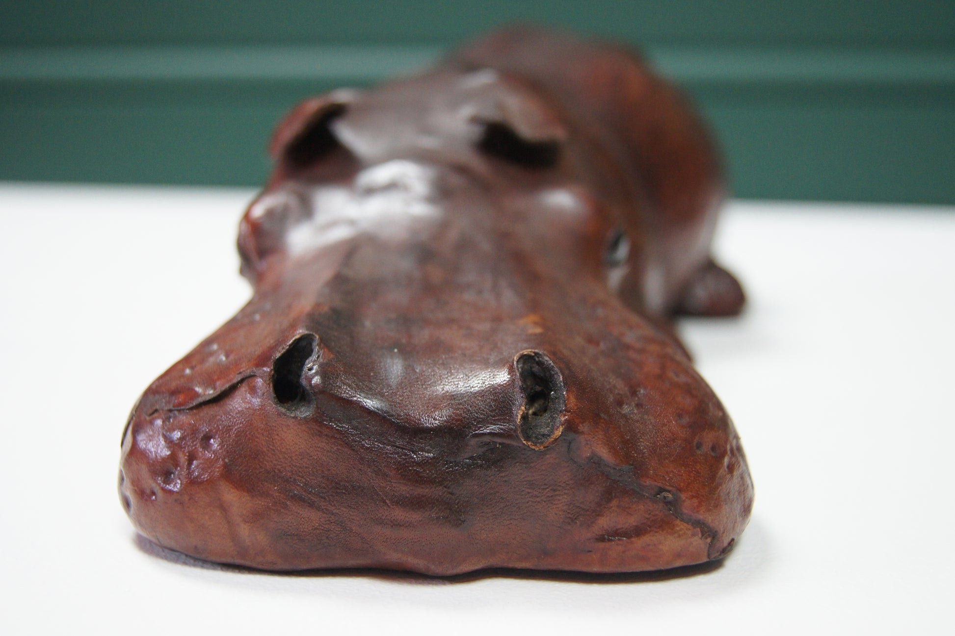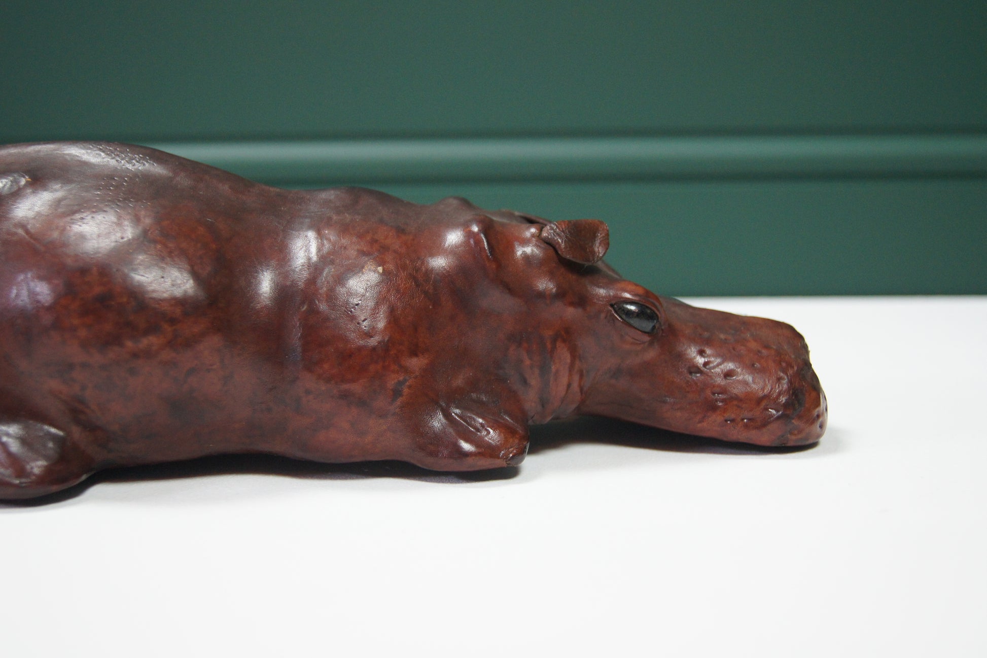 Crafted in rich brown leather with a distinctive Liberty style, this large hippopotamus figurine combines artisanal quality with timeless design. Its durable leather construction ensures longevity, making it a striking decorative piece that adds both texture and sophistication to any room. Perfect for collectors or those seeking a unique statement accessory in their home or office.