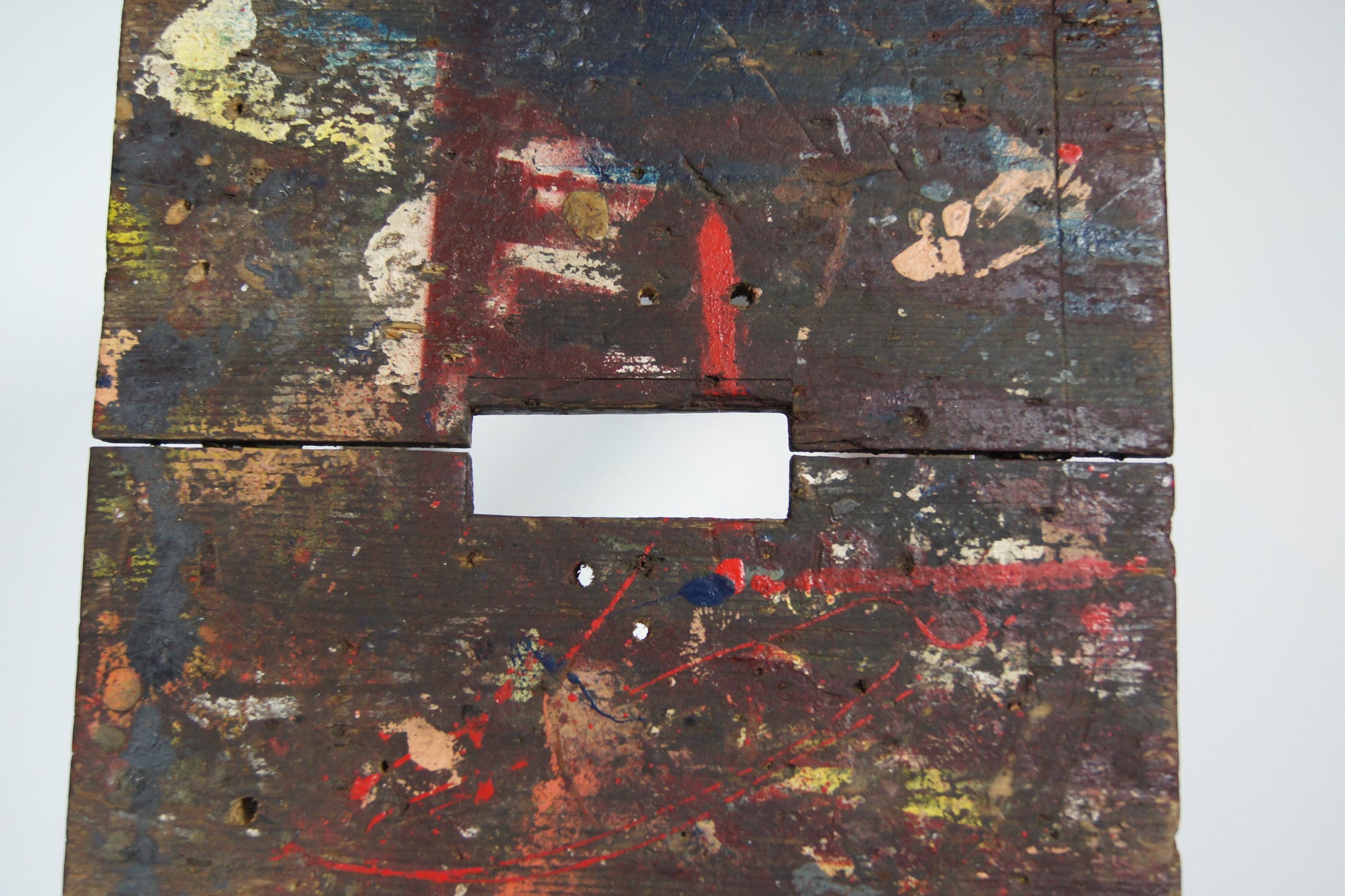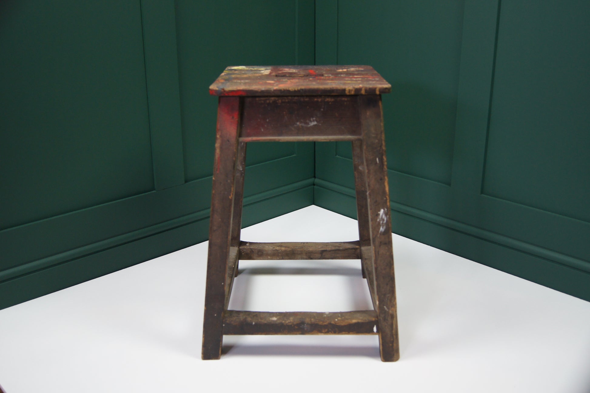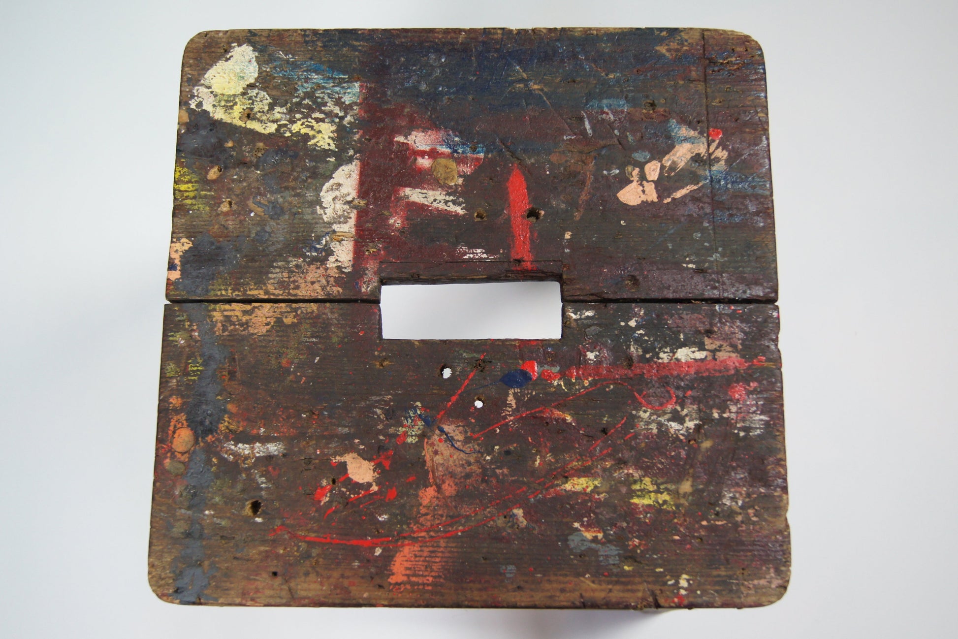 Add a splash of fun to your space with this large wooden stool! Its sturdy industrial design is perfectly paired with bright, playful paint splatters from it's previous life, which adds to it's character. Durable and eye-catching, it’s the perfect seat for creative moments or a bold accent in your décor.