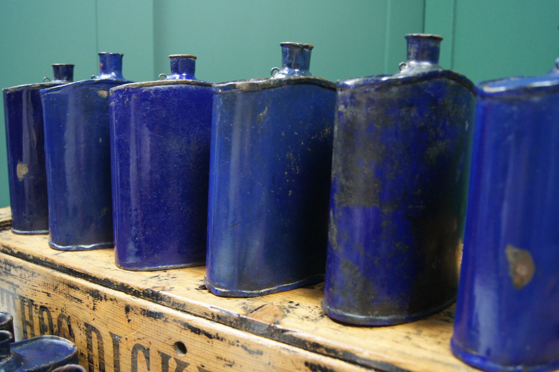 Our vintage military water flasks feature a stunning cobalt blue enamel finish, seamlessly blending classic design with practical use. Celebrated for their durability and historical significance, they served widely with British and Indian troops during WW1 and WW2 eras. Today, they offer a unique charm as an elegant display piece or quirky vase, making them a distinguished addition to any vintage collection.